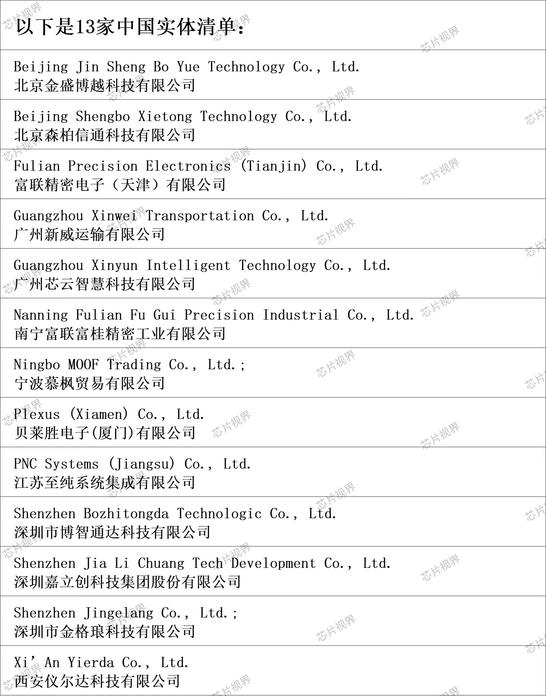 BIS在通告中详细列出了这些企业的名称和地址,其中包括两家隶属于富士康旗下的公司:富联精密电子(天津)有限公司和南宁富联富桂精密工业有限公司,以及国内知名的电子元器件交易平台的关联公司嘉立创科技集团股份有限公司和云汉芯城全资子公司广州芯云智慧科技有限公司均在列。